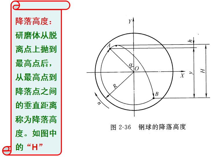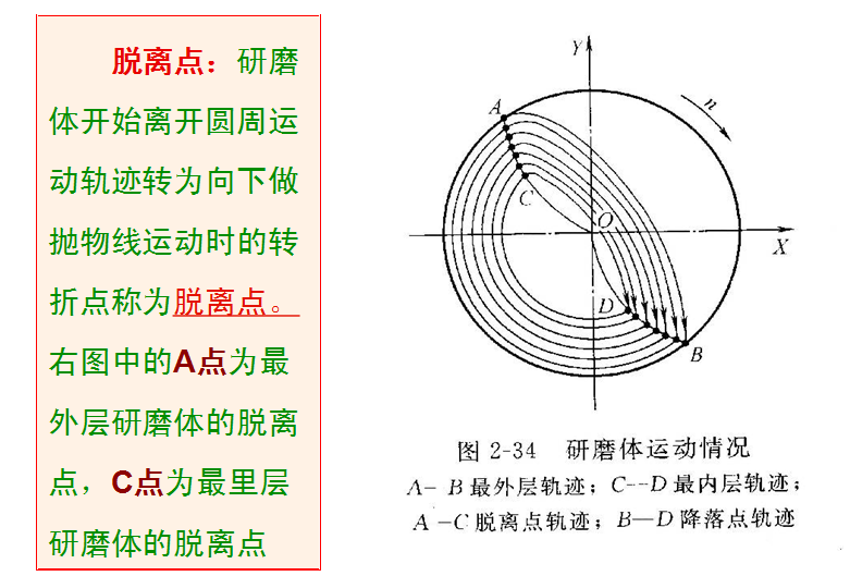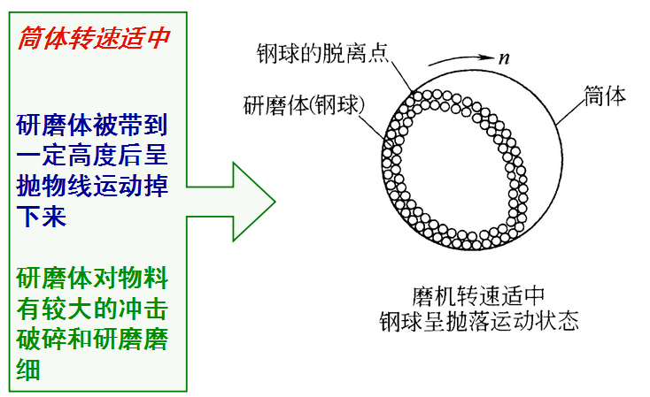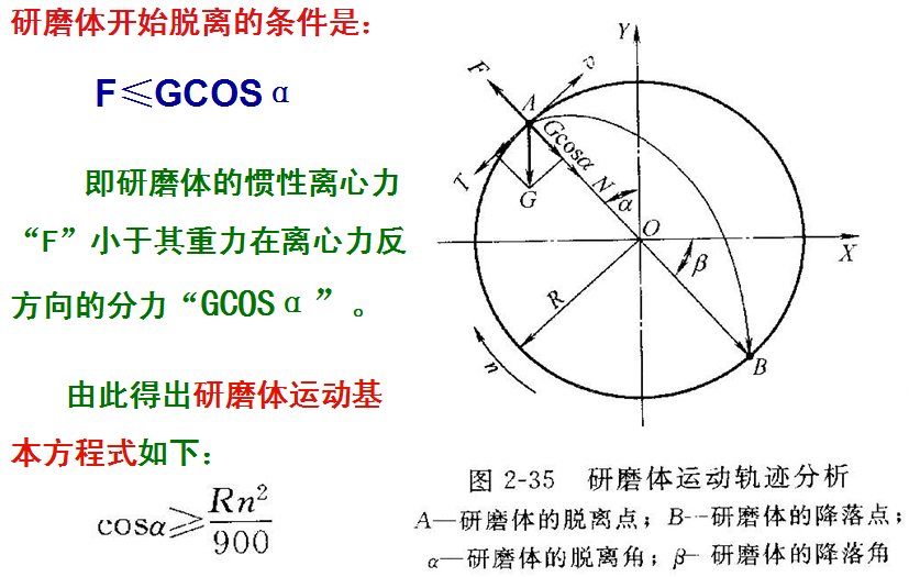 研磨體運動基本方程式的含義:研磨體脫離角(或降落高度)與筒體轉(zhuǎn)速及研磨體所在半徑有關(guān),而與研磨體質(zhì)量無關(guān)。